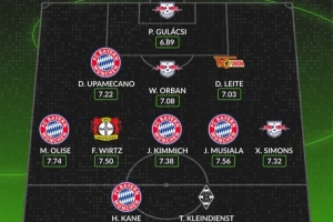 中场:奥利塞(拜仁,7.74分)、维尔茨(勒沃库森,7.50分)、基米希(拜仁,7.38分)、穆西亚拉(拜仁,7.56分)、哈维-西蒙斯(莱比锡,7.32分)